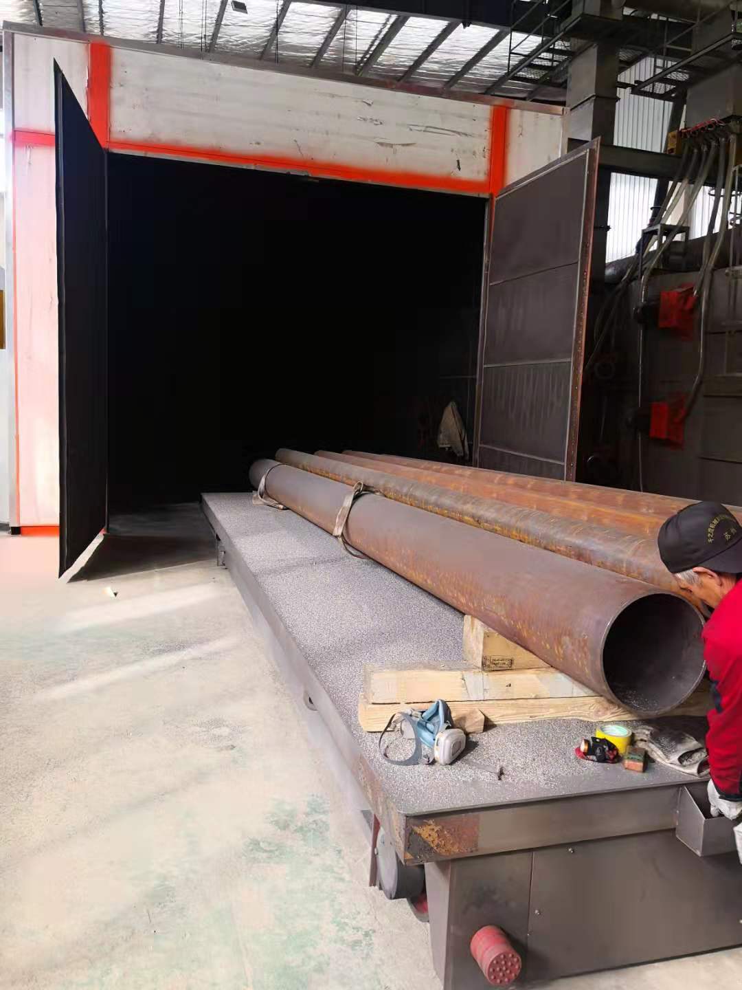 設備特點:本設備是我司針對輪胎模具,重型工件類等產品的處理要求而專門設計的臺車輸送式自動噴砂機,采用臺車輸送工件,配置6支噴砂槍,1支手動噴槍,手動噴槍可對產品進行補噴,共設置1根擺動軸,帶動噴槍做擺動形式噴砂加工作業,噴砂加工角度可根據工件布置,情況調整,在保證噴砂效果的同時,保證了噴砂加工的效率。通過機艙內調節擋板調控不同類型工件噴砂與非噴砂區域,可有效防 塵。本設備工件輸送及噴砂加工均為自動化作業,其自動化程度較高。